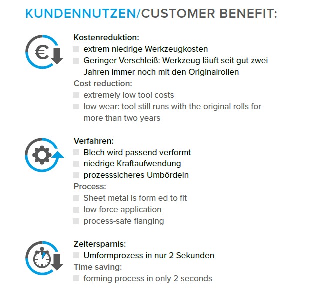 <A forming process with a flanging tool from Baublies suitably deforms the shee tmetal and fixes the machined parts: The sheet metal cap, which is flanged in two seconds, makes the design food-safe and dishwasher-safe.