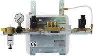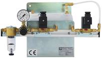 Assembly consisting of a polyethylene tank (2.5 - 25 litres) with a support for wall mounting and valve assembly with a maintenance unit. At the maintenance unit is connected the unfiltered and non-lubricated air power (6 - 9 bar). The spray air pressure is set with the pressure regulator. We recommend a low spray air pressure of 0.5 to max. 1.5 bar. By the solenoid valves 24V DC in air and fluid pipes is a mounting of the valve and container groups up to max. 1000 mm of upper as also underneath the spray heads possible. That means with the use of multiple spray heads these can be arranged in different levels to each other and/or to the valve and container group constructions.