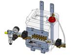 Stationary valve and container groups for joint operation of max. 3 spray heads with a maximum of 6 spray nozzles (for example PCJ 2 fold spray heads = 2 spray nozzles, PTR spray head = 1 spray nozzle). Specifications such as TC-1-fold, but with 5-liters container, electrical control over each 1 air and fluid valve with 24V DC.