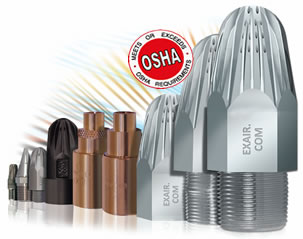 EXAIR高壓噴嘴和(hé)射嘴是以壓縮空氣為(wèi)動力、解決吹洗應用場合耗氣量大噪音高的簡單方法,其氣流增強率最高可(kě)達25倍。與開(kāi)口式銅管或導管相比,可(kě)節約80%壓縮空氣。因為(wèi)耗氣量少(shǎo),從(cóng)而噪音也低(dī),一(yī)般情況下(xià),噪音比其他(tā)類似設備低(dī)10分貝。所有噴嘴和(hé)射嘴都(dōu)符合OSHA的相關要(yào)求。