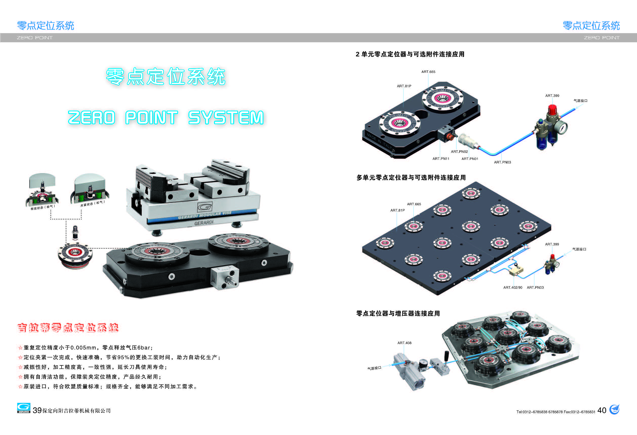 零點定位系統,是一(yī)個獨特的定位和(hé)鎖緊裝置,能(néng)保持工(gōng)件從(cóng)一(yī)個工(gōng)位到另一(yī)個工(gōng)位,一(yī)個工(gōng)序到另一(yī)個工(gōng)序,或一(yī)台機床到另一(yī)台機床,零點始終保持不變。這(zhè)樣可(kě)以節省重新找正零點的輔助時(shí)間(jiān),保證工(gōng)作(zuò)的連續性,提高工(gōng)作(zuò)效率。