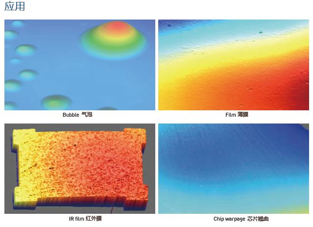 由于産品表面的測量隻有一(yī)個圖像,因此可(kě)以進行(xíng)飛拍,從(cóng)而實現大面積的快(kuài)速測量。可(kě)以檢查和(hé)測量通(tōng)常難 以測量的産品表面缺陷,例如(rú)大于幾微(wēi)米的晶圓芯片表面的缺陷、相機膠片的翹曲以及透明(míng)表面上(shàng)的氣泡測量。