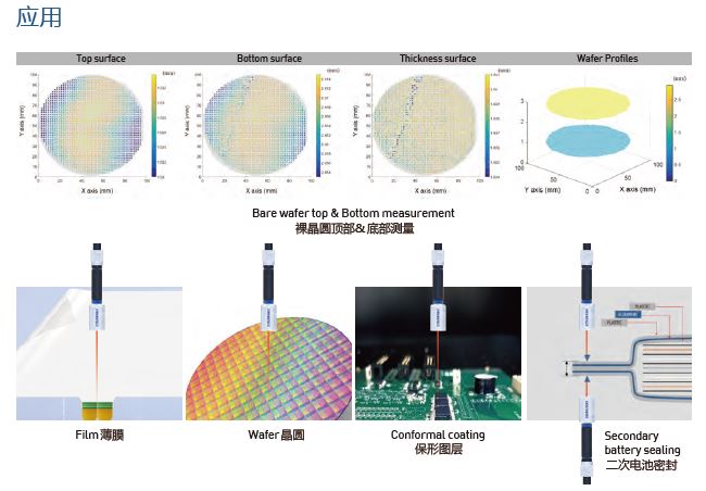 通(tōng)過使用不同波長(cháng)的光(guāng)源,nXV-1測量透明(míng)産品(如(rú)薄膜和(hé)玻璃)以及不透明(míng)或粗糙産品(如(rú)矽和(hé)藍(lán)寶石晶片)的厚度。可(kě)用于厚度難以測量的産品,如(rú)二次電池(密封厚度)和(hé)PCB保形塗層。